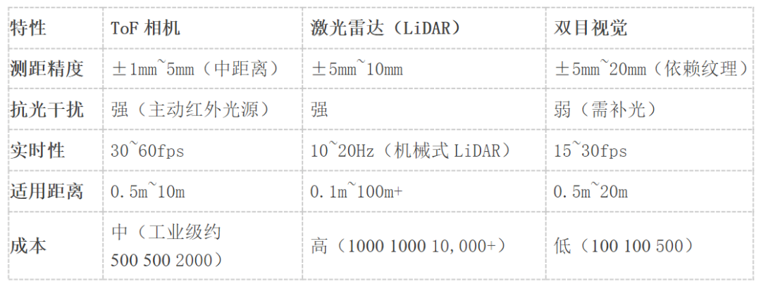 Time-of-Flight(ToF)是三大主流3D成像技术之一(另两种为结构光与双目立体视觉)。其原理是通过发射近红外光并计算光线往返时间,直接获取物体的距离信息(深度)。相较于其他技术,ToF具有计算简单、抗干扰强、远距离测量的优势,因此被广泛应用于手机后置摄像头(如华为/OPPO/苹果)、工业自动化、AGV导航和机器人抓取等领域。